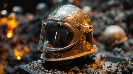 Mining helmet with integrated lamp, showing rugged construction and dust accumulation in crevices
