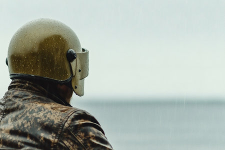 A lone motorcyclist stands near the shore, gazing at the ocean as rain lightly falls. Clad in a weathered jacket and a helmet, the figure reflects on the unpredictable beauty of nature, merging adventure with tranquility.