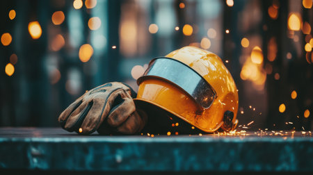 A close-up view of a bright orange safety helmet and protective gloves placed on a workbench, showcasing industrial safety elements amidst flying sparks and an energetic backdrop.