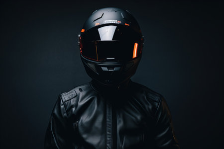 Side profile of a person in a sleek, black motorcycle helmet and leather jacket against a dark background, with space for text on the left