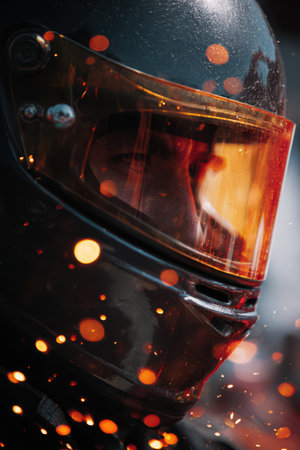 A dramatic close-up reveals the helmet visor reflecting vivid race lights and flying sparks during an adrenaline-filled go-karting night event.