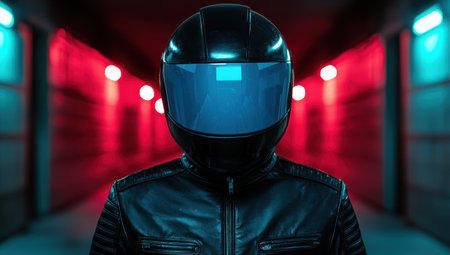 A rider stands in a dimly lit urban environment wearing a high-tech helmet featuring glowing patterns.