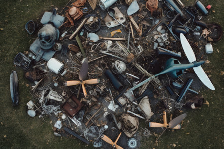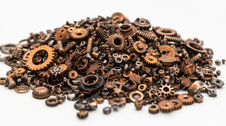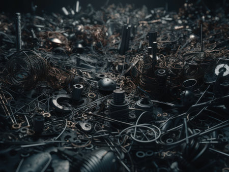 A striking close-up image capturing a pile of metallic shavings and scrap parts. The image highlights the textures and details of various industrial components in a workshop setting.