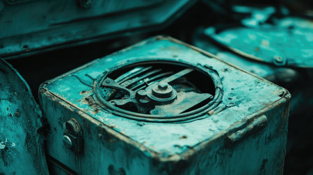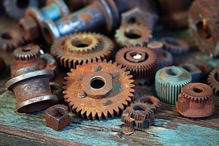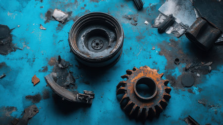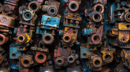 A captivating arrangement of colorful vintage machine parts showcasing unique textures and rust patterns. Perfect for industrial-themed projects.