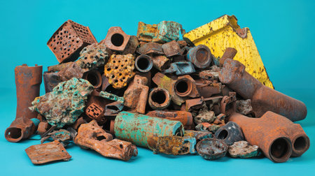 A vibrant display of rusty metal scraps and broken pipes creates an intriguing still life composition against a bright blue background, showcasing texture and decay.