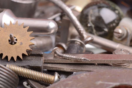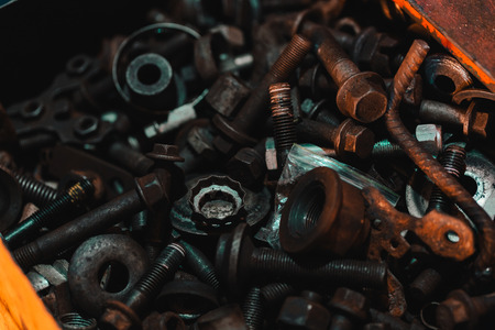 Pile of fasteners and screws close up. scrap metal. different metal parts