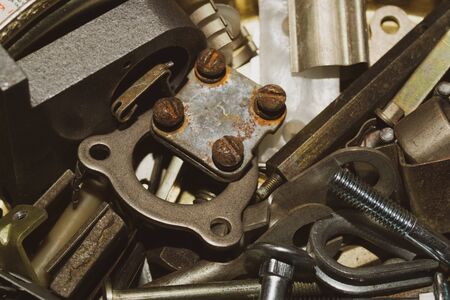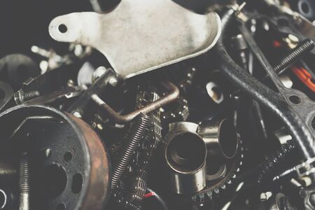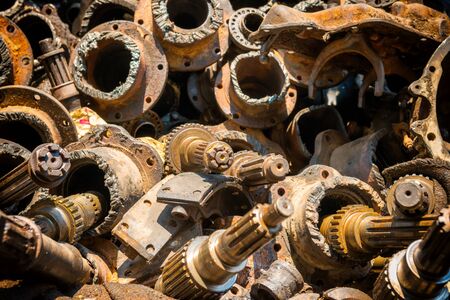 Pile of old machine parts in second hand machinery shop, background of damage and rusty old car machine