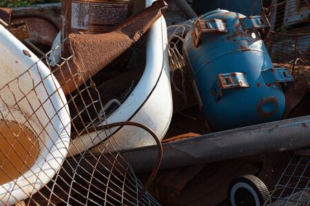 Closeup view of pile of old rusty metal scrap, used machine spares and car parts can be used as mechanic industrial background