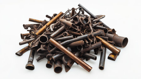 A captivating assortment of vintage metal pipe parts and scrap, showcasing a variety of textures and shapes, perfect for creative projects and industrial design inspiration.