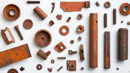 A captivating collection of rusty metal parts arranged on a white background, showcasing various shapes and sizes, ideal for industrial design projects or grunge aesthetics.
