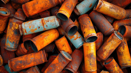 Old, rusty artillery shells in a metal heap, captured in industrial ruin and worn textures