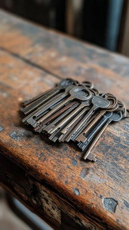 A set of worn metal keys is neatly placed on an aged wooden table, showing their vintage character and intricate designs. The background suggests a cozy, rustic setting.