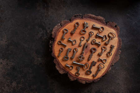 Collection of different old keys on a rustic background