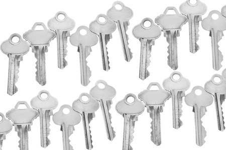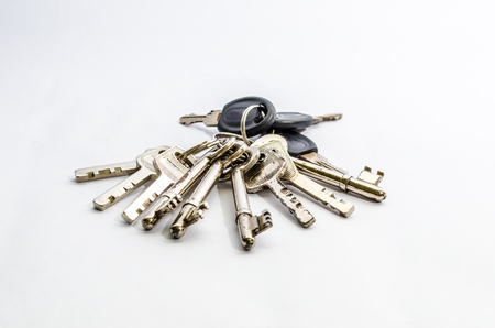 collection of different house keys isolated on white background.