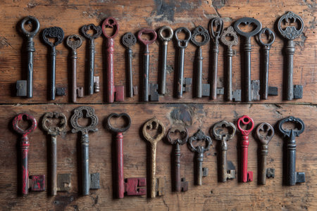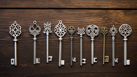 A collection of vintage keys placed on a table. This image can be used to represent concepts such as antique, nostalgia, security, or unlocking mysteries.