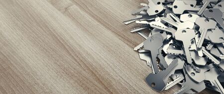 Many assorted metal keys on wooden table background. Home security concept. 3d rendering