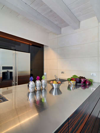 vegetables on the steel worktop near to the sink in a modern kitchen