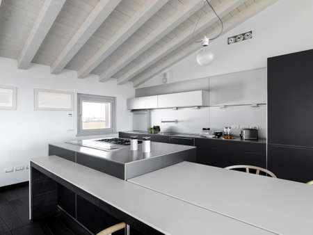 Cropped view of modern kitchen in white tones with white surface, black sink and decor. Cozy place for cooking. luxury cuisine interior design
