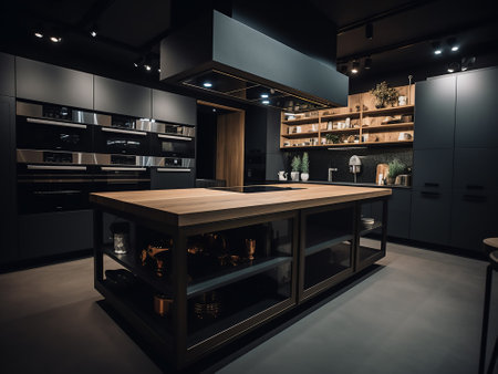 Modern black kitchen interior with wooden countertop and black cabinets. 3d rendering