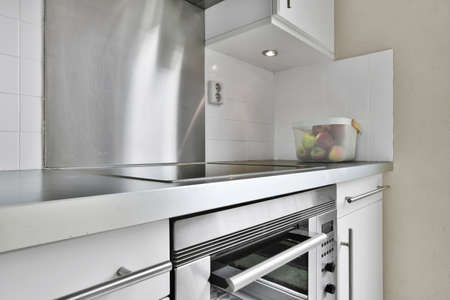 Fragment of interior of light narrow home kitchen with minimalist style white furniture with sink and stove