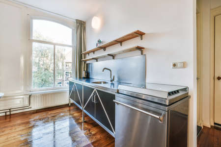 Well organized small home kitchen interior with sink under window and light furniture with stove and fridge in urban apartment
