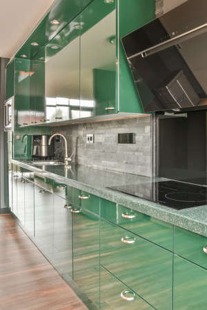 Kitchen in green design with modern appliances and a marble countertop in a cozy modern house