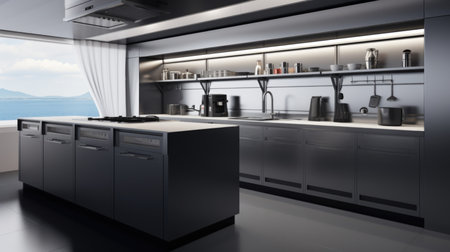 Dark kitchen interior with sink and appliances, hidden cabinets. Bowls and soap bottles, towels and shelves. Cooking space in modern apartment, 3D rendering