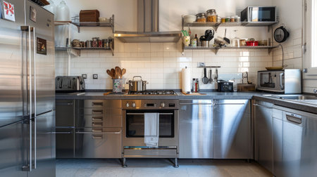 Paris, France - Jul 12, 2024: Low-angle view of an iconic IKEA kitchen with multiple accessories, resembling a home setting, with no customers present