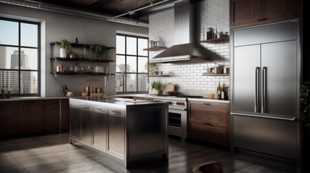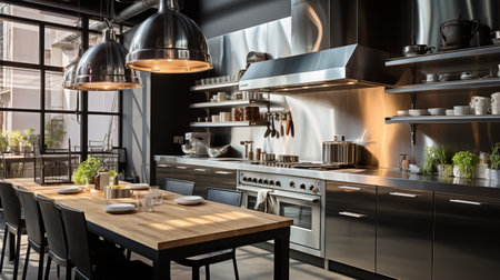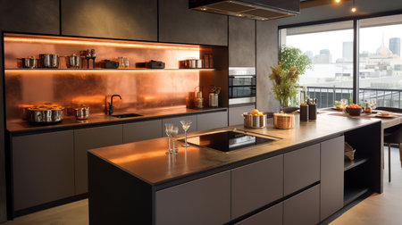 3d Illustration of grey modern kitchen in a house with a beautiful design