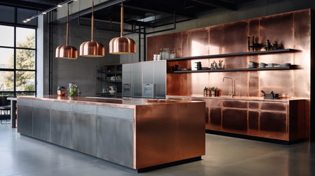 Contemporary kitchen with gold-colored brass sink and black gas hob