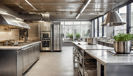 Bright kitchen filled with stainless steel surfaces showcasing expertly prepared culinary dishes.