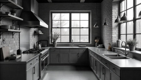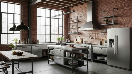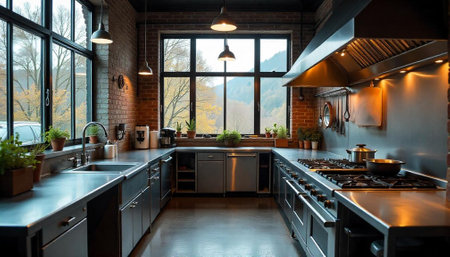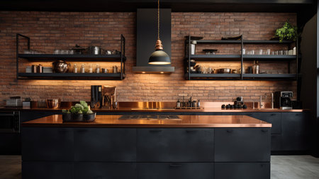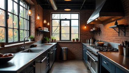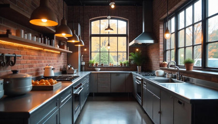 Cozy industrial style kitchen featuring brick walls and warm lighting
