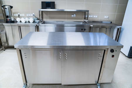 professional kitchen equipment. Stainless steel kitchen furniture. Kitchen coffee. Grease trap. Preparing the restaurant for the opening. Concept - preparation of equipment before opening