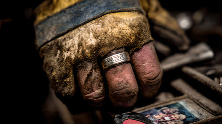 Close-up of a worker's hand wearing a ring, holding a framed photo, symbolizing memories and hard work.