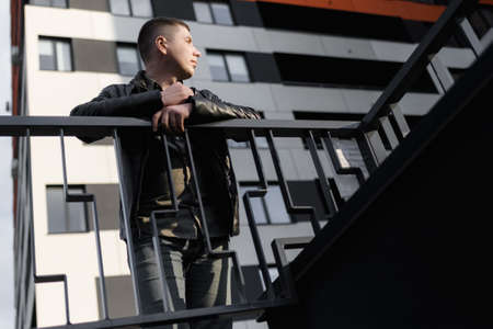 A man is standing at the railing of the subway stairs, looking to the side against the background of a high-rise building. street portrait