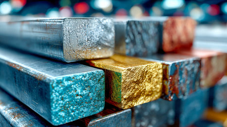 Stacked metal bars in various colors and textures, highlighting industrial materials.
