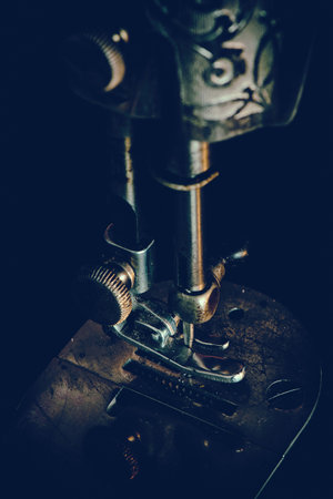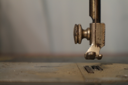 Closeup the old sewing machine,vintage style. Fabric worck tools. Macro neddle.