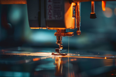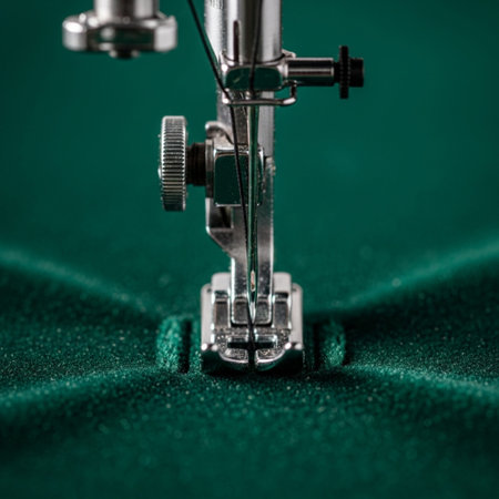 This image showcases a precision sewing machine at work, highlighting the intricate details of stitching on a textured fabric surface, emphasizing craftsmanship.