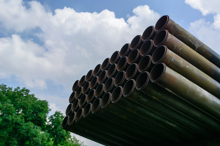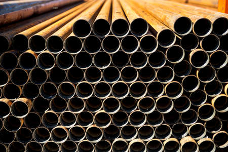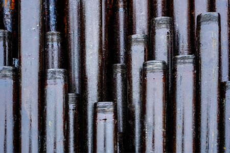 Texture oil drill pipe. Rusty drill pipes were drilled in the well section. Downhole drilling rig. View of the shell of drill pipes laid in courtyard of the oil and gas warehouse