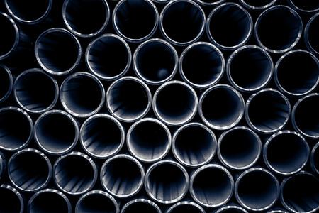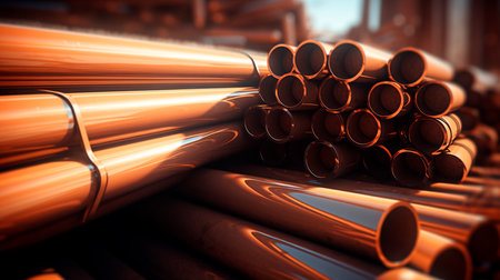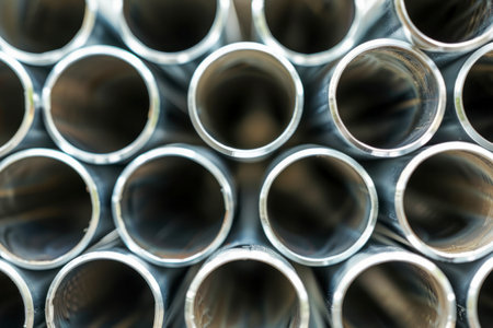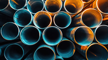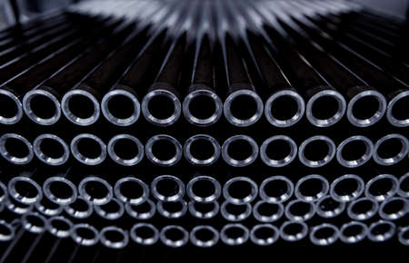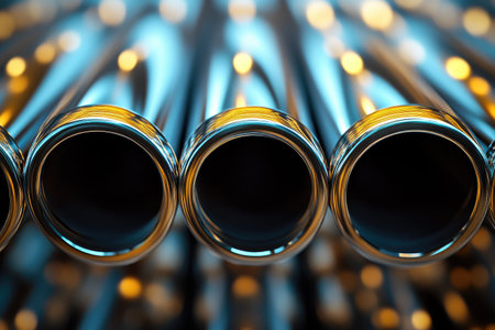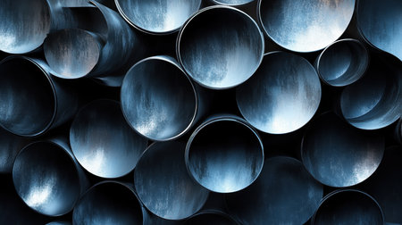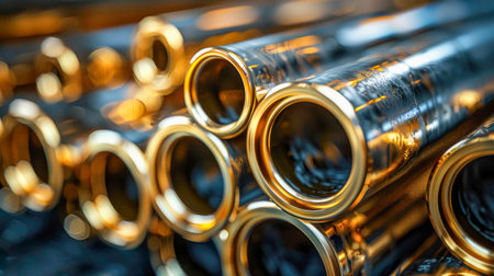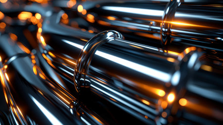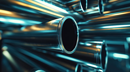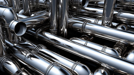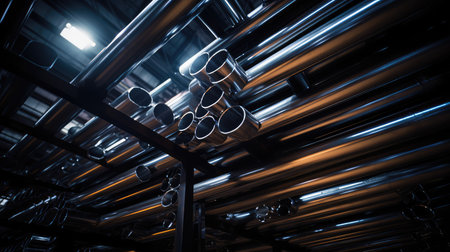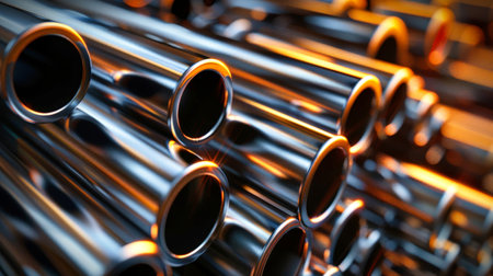A collection of metallic pipes is arranged in a stacked formation, showcasing their smooth surfaces and reflections. The lighting emphasizes the industrial nature of the materials.
