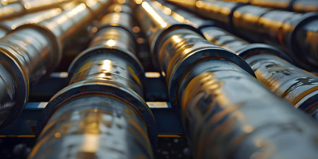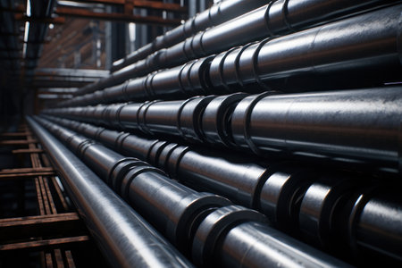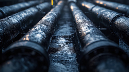 Steel pipes in an industrial setting used for transporting energy resources like oil and water. Concept Industrial Piping, Energy Transportation, Steel Pipes, Oil Industry, Water Distribution