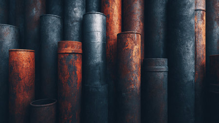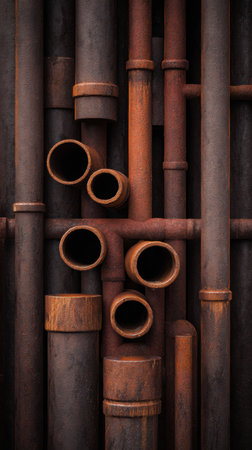 Close-up view of various rusty pipes arranged against a weathered wall, highlighting the textures and colors from years of exposure in an urban environment