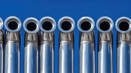 A striking image of metallic pipes set against a clear blue sky, showcasing shiny surfaces and circular openings. Ideal for industrial and architectural themes.