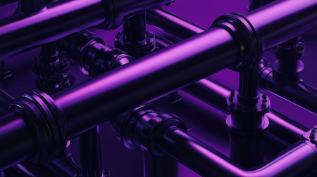 This abstract image depicts interconnected metallic pipes illuminated by a vibrant purple hue, featuring intricate details and showcasing modern industrial design.