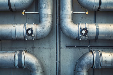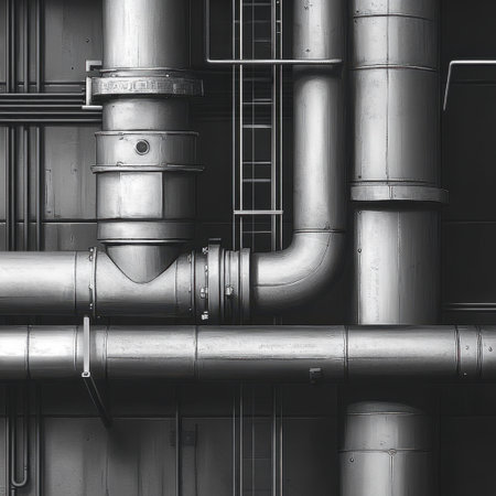 Close-up of large industrial pipes featuring flanges and rivets. The intricate design showcases the raw materials and engineering customizations in an urban setting.
