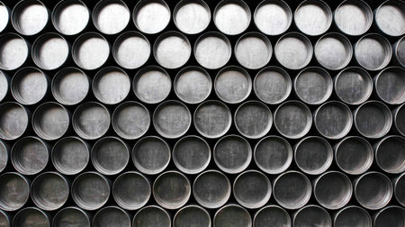 A close-up view of circular metal containers arranged neatly in rows, showcasing their industrial design and the unique textures of their surfaces.
