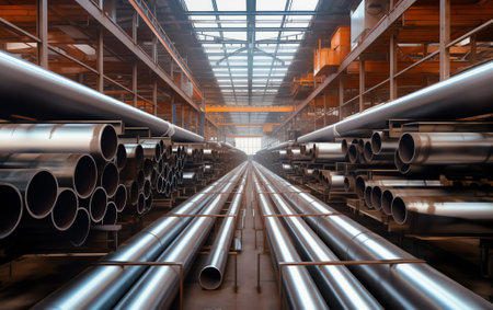 View of numerous polished metal pipes neatly stacked and arranged in rows on the floor of a large, modern industrial factory or warehouse facility.
