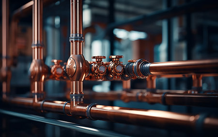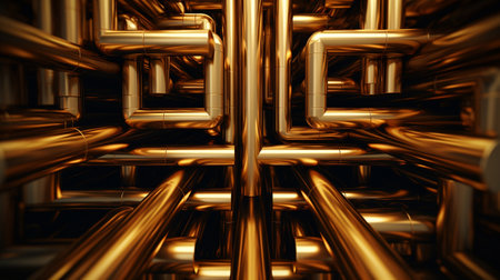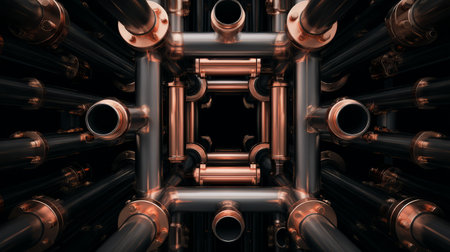 Industrial hallway with symmetrical copper pipelines and reflections. Generative AI