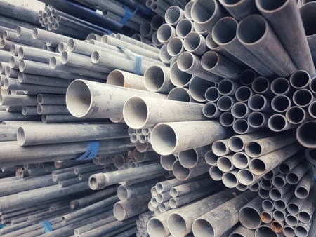 Large metal pipes stacked in rows, with ample room for copy space in the background