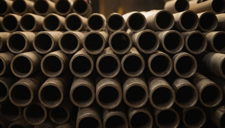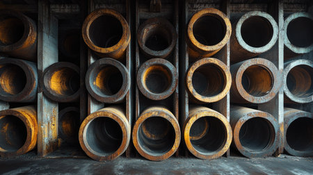 Concrete pipes stacked in an orderly manner at an industrial site, emphasizing ruggedness and practical design.